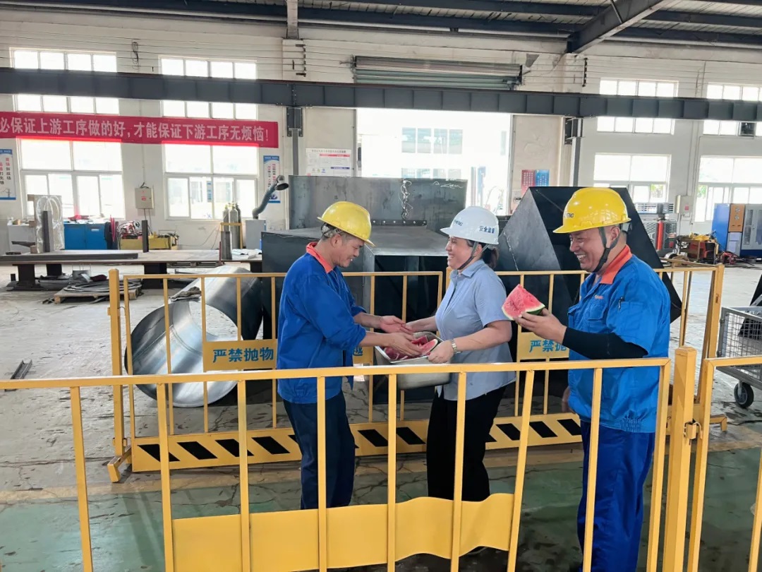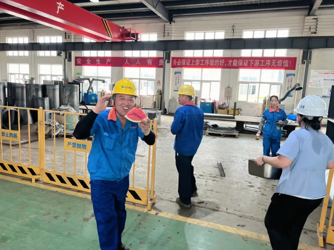 7月22日下午,午夜成人免费观看科技公司董事長端木順寶、裝備製造事業部總經理夏和平,準備了西瓜、飲料等防暑降溫用品,看望並慰問奮戰在生產基地一線的員工,讓大家在酷暑中感受到舒心的涼意。